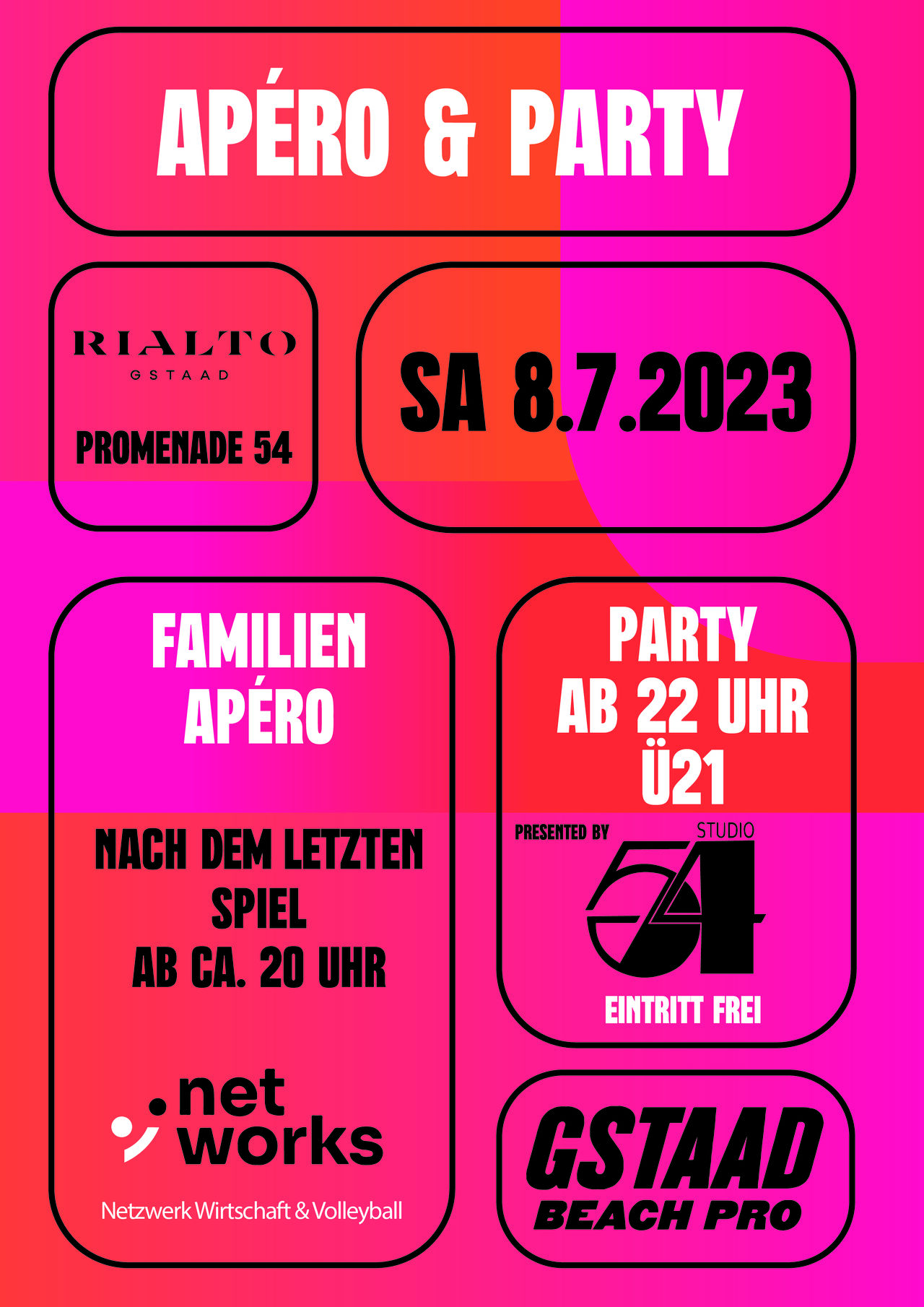 Das Netzwerk Wirtschaft & Volleyball trifft sich zum Apéro nach dem letzten Spiel am Samstag in Gstaad. Der richtige Ausklang für alle Beach-Fans und der richtige Austausch rund um den Volleyball!